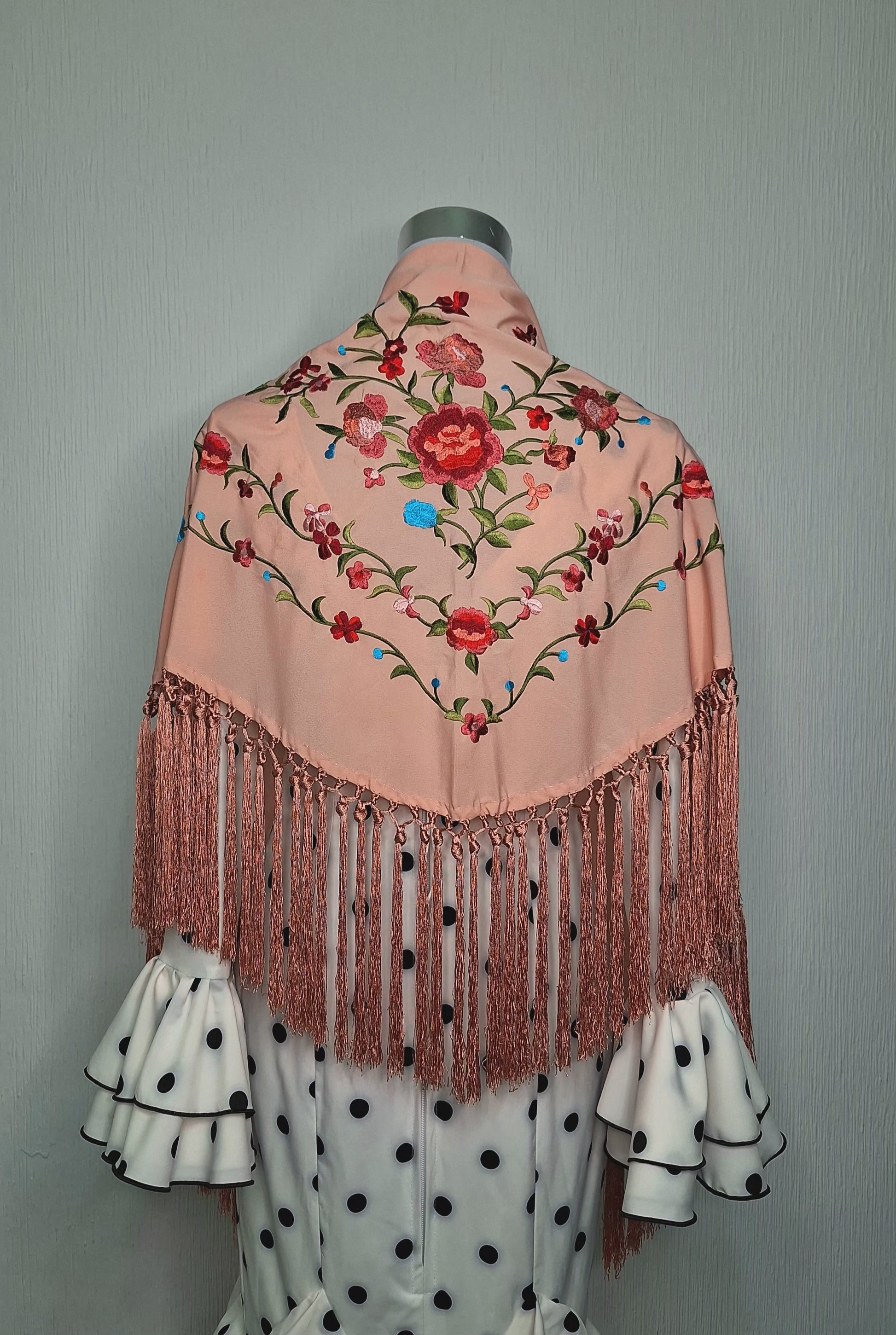 Mantoncillo de flamenca Abril Rosa Nude con bordados de colores. Bordado en seda. Flecado a mano en seda, con fleco de borlón.